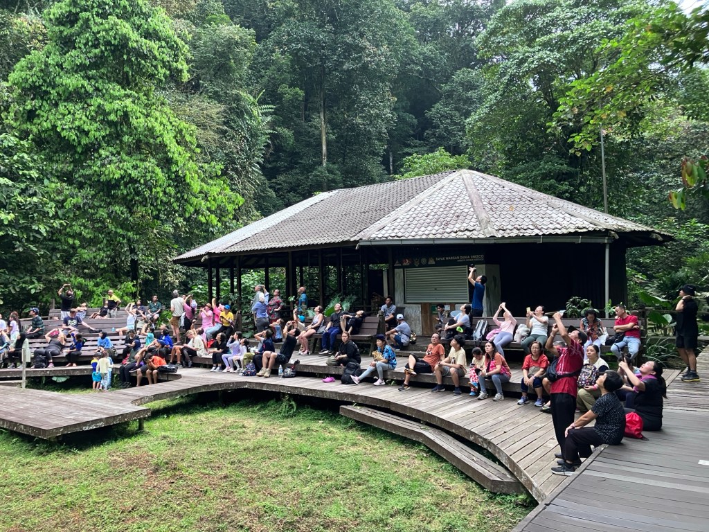 Semenggoh Wildlife Center is a 1,600 acre/653 hectares forest with a population of semi wild orangutans who are fed to supplement their wild diet. The acreage is not enough to support the animals with wild naturally occurring food. Founded as a sanctuary for rescued orangutans, the center has an established population with babies regularly joining the group. Visitors are let in morning and afternoon for the feedings of sweet potatoes, bananas, coconut, papayas, oranges, sugar canes, pineapples and hard boiled eggs. There is no guarantee that the orangutans will show up, they may just stay in the forest eating naturally growing fruit, especially during g fruiting season which it was. Thankfully the draw of food was enough to tempt out four the morning we went.