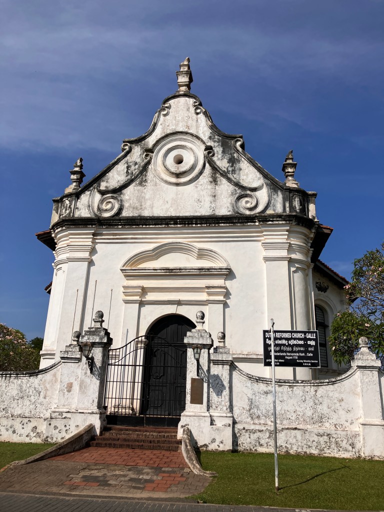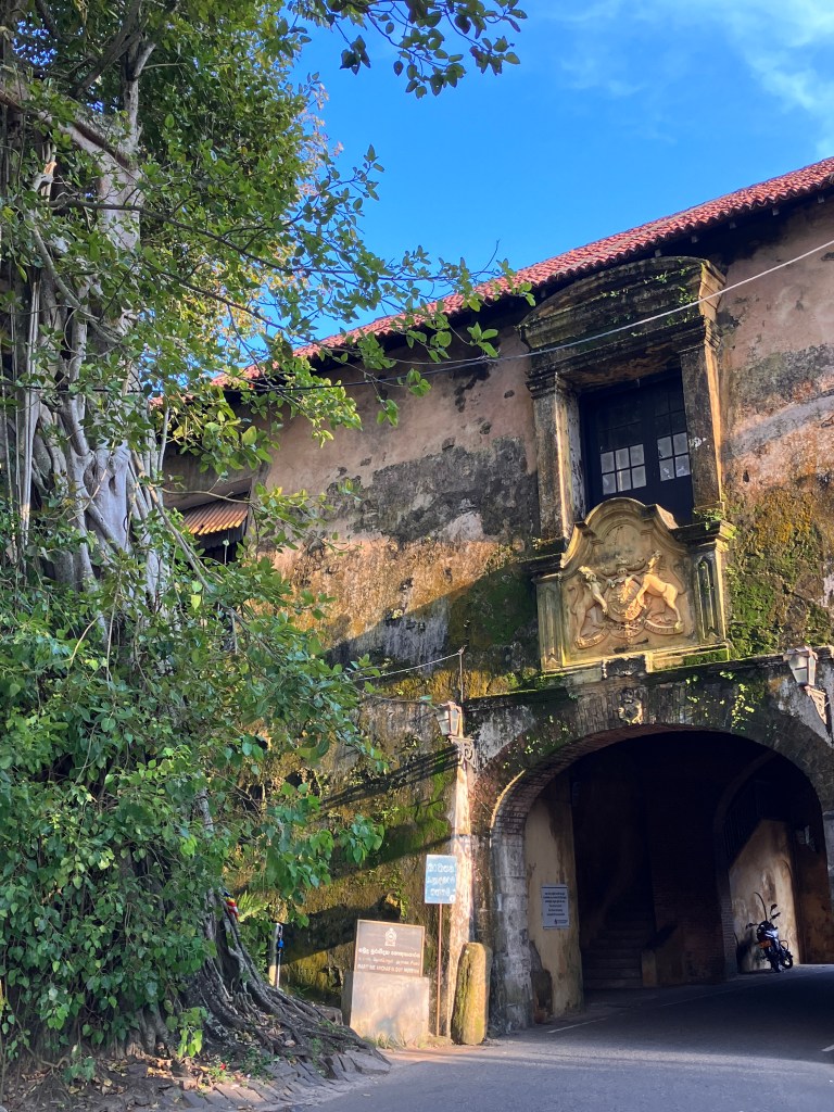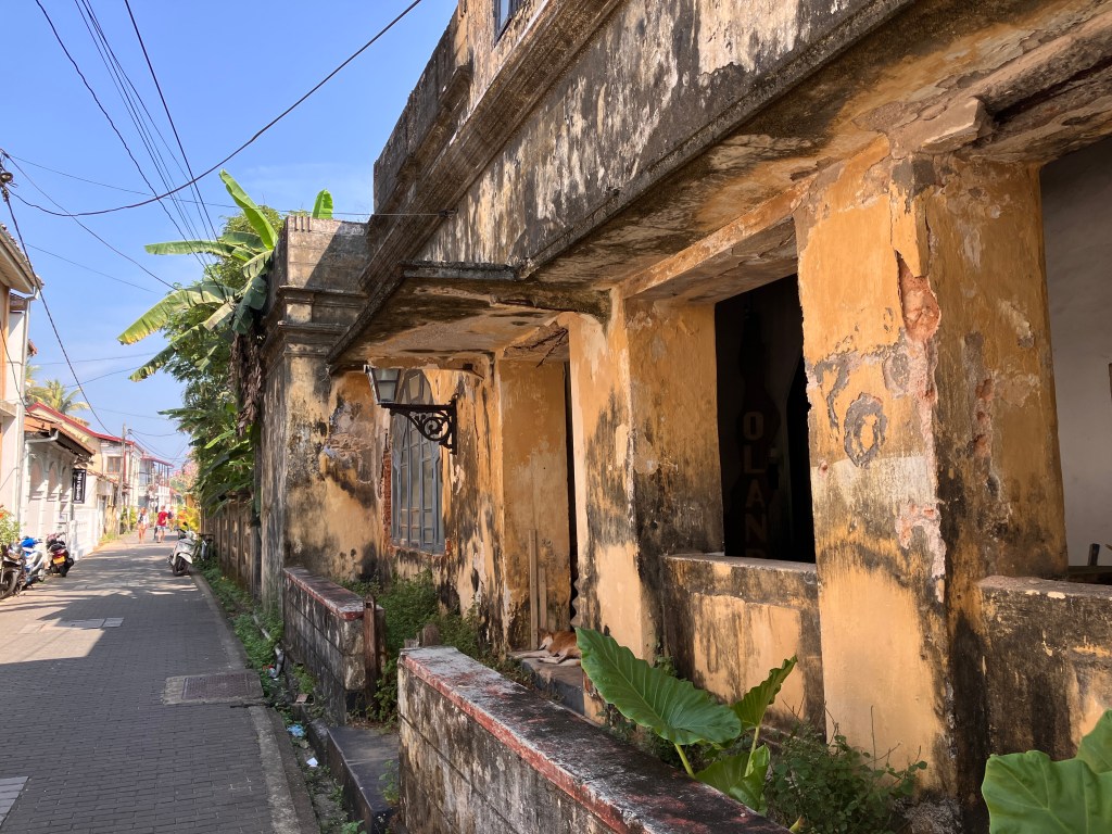 Dutch church in the fort under sunny skies.Anglican Church. Right down the street.Locals outside the courthouse in the shade of a banyan tree.Some older buildings still being fixed up. The street signs are in Sinhala, English, and Tamil. I love the colors of this wall.