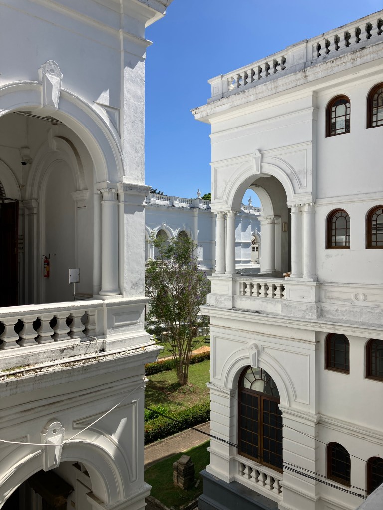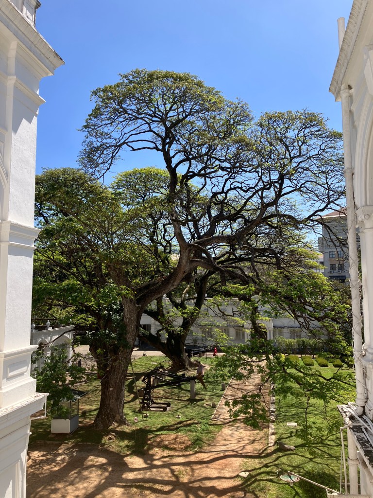 Chicken Kottu. Kottu translates from Sinhalese as chopped, and this popular Sri Lankan street food consists of chopped up roti (a type of flatbread), stir-fried with chicken, vegetables and egg. Delicious. Sunday morning iced coffee on our way to a museum. Living the normal tourist life.Ah, shady sidewalks. Yes, it’s hot and humid in Colombo, but the walking is good. The National Museum. A good destination on a hot sunny day. More amazing big trees at the museum. The shade is so welcome.