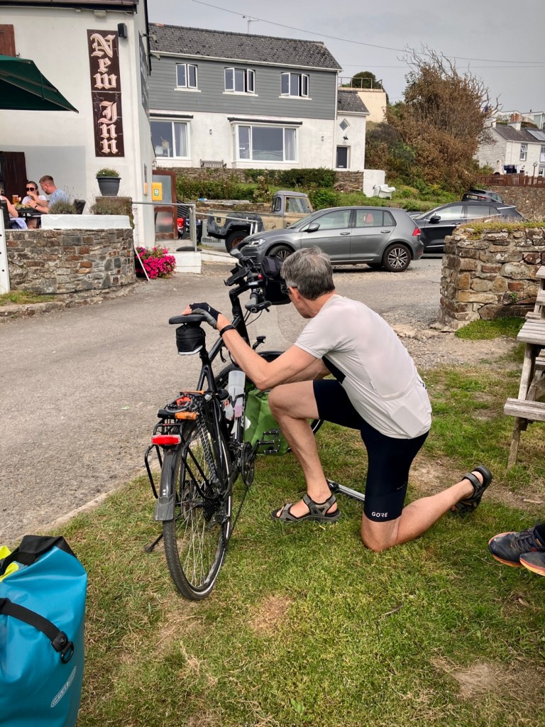 What are the odds of meeting up with a local we know in Wales? Pretty good apararently, as our friend Alex drove by us on this county road. So we all met down the road for a pub lunch in the lovely and rare warmth.Bragging about our 3 1/2 months without a flat finally caught up with me after our pub lunch in Amroth. (Still love our Schwable Evolution /Almotion tires though.)There is some nice new bike infrastructure along NR4 in Wales and it was definitely better than the segments west of London.
